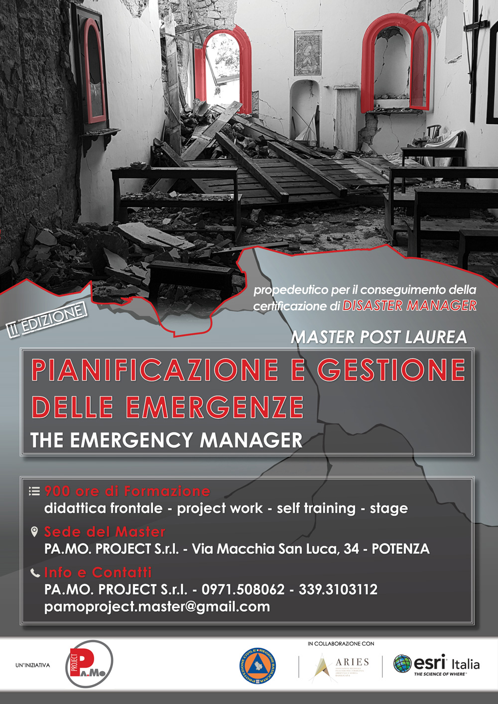 PA.MO PROJECT SRL, in collaborazione con la PROTEZIONE CIVILE - REGIONE BASILICATA, ARIES Basilicata (Associazione Regionale Ingegneri per l’Emergenza Ambientale e Sismica) e ESRI, organizza il Master post laurea in PIANIFICAZIONE E GESTIONE DELLE EMERGENZE - THE EMERGENCY MANAGER.
