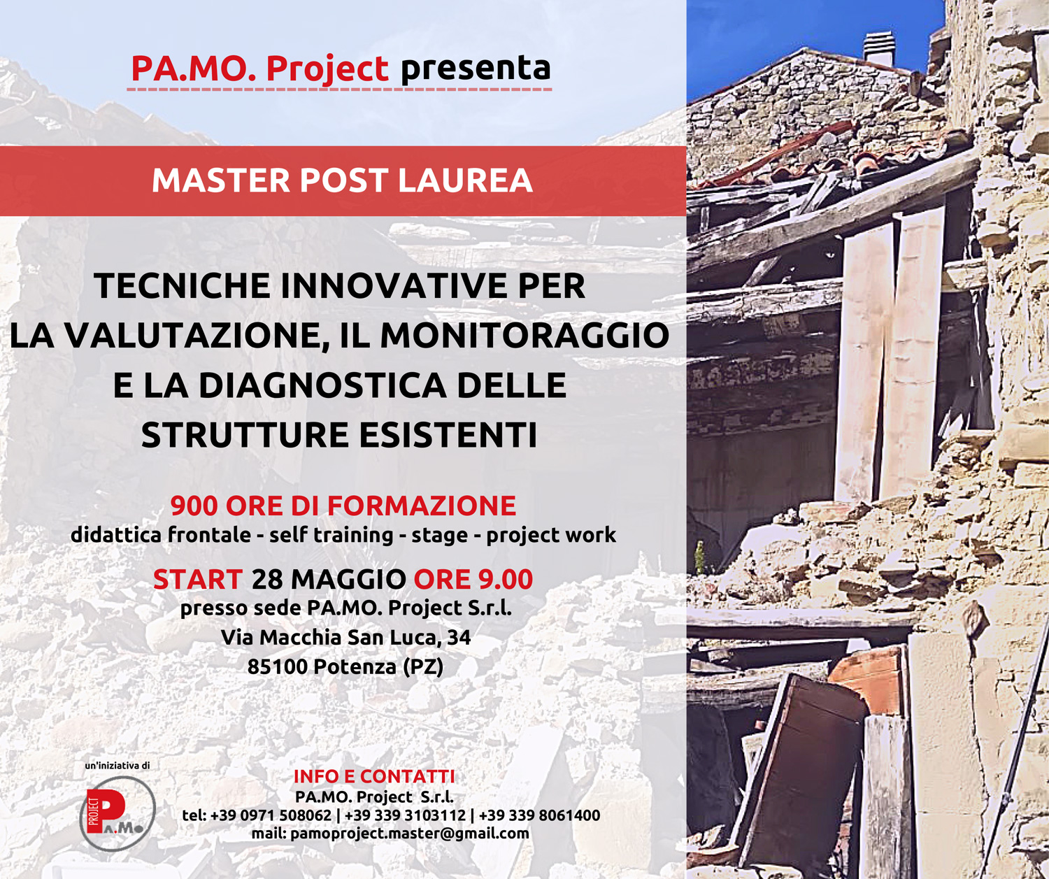 PA.MO. PROJECT SRL organizza il Master post laurea in TECNICHE INNOVATIVE PER LA VALUTAZIONE, IL MONITORAGGIO E LA DIAGNOSTICA DELLE STRUTTURE ESISTENTI.